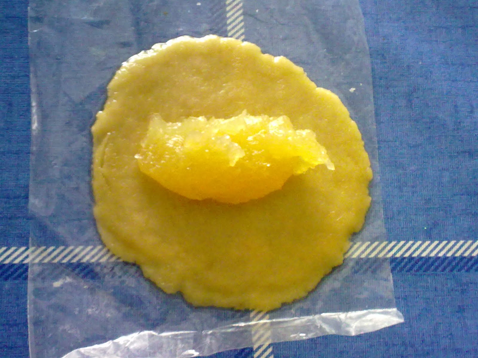 Quitamos el plástico de encima y en el centro de la masa ponemos una cucharada sopera de confitura de boniato o un poco más.